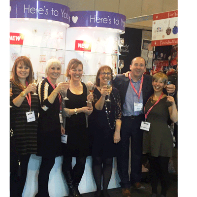 Toasting the success of the launch of the new 'Here's to You' glassware range at the NEC are the UK-based card designers working with Gaeltag Keltika on their 24 new products.
