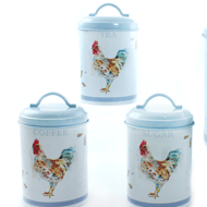 Shown here are tea, coffee and sugar containers, each one of excellent quality, illustration under license from Jennifer Rose and gift packaged for presentation and display purposes.